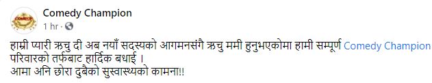 टीभी रियालिटी शो कमेडी च्याम्पियनको आधिकारिक पेजमा उनले छोरालाई जन्म दिएको जानकारी दिइएको छ । उक्त पोस्टलाई नायिका अभिनेत्री केकी अधिकारीले पनि सेयर गर्दै बधाई दिएकी छिन् । अहिले उक्त पोस्टमा बधाई दिनेको ओइरो लागेको छ ।