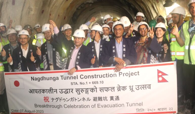 नेपालको यातायात क्षेत्रको पहिलो आधुनिक सुरुङमार्ग निर्माण थालिएको तीन वर्ष सात महिनामा आपत्कालीन सुरुङको सोमबार ‘ब्रेक थ्रु’ गरिएको हो । नागढुङ्गा सिस्नेखोला सुरुङमार्गअन्तर्गत उक्त सुरुङको सोमबार भौतिक पूर्वाधार तथा यातायातमन्त्री प्रकाश ज्वाला, नेपालका लागि जापानी राजदूत किकुता युताकाले दुवै देशको संस्कृतिअनुसार पूजा गरेर ‘ब्रेक थ्रु’ गरेका हुन् । सो अवसरमा भौतिक राज्यमन्त्री नन्दा चपाईं , सडक विभागका महानिर्देशक सुशीलकुमार ढकाल, मन्त्रालयका सचिव केशवकुमार शर्मा, सञ्चारकर्मी, सो क्षेत्रका स्थानीय तहका प्रमुखलगायत सुरुङभित्रै सहभागी थिए ।