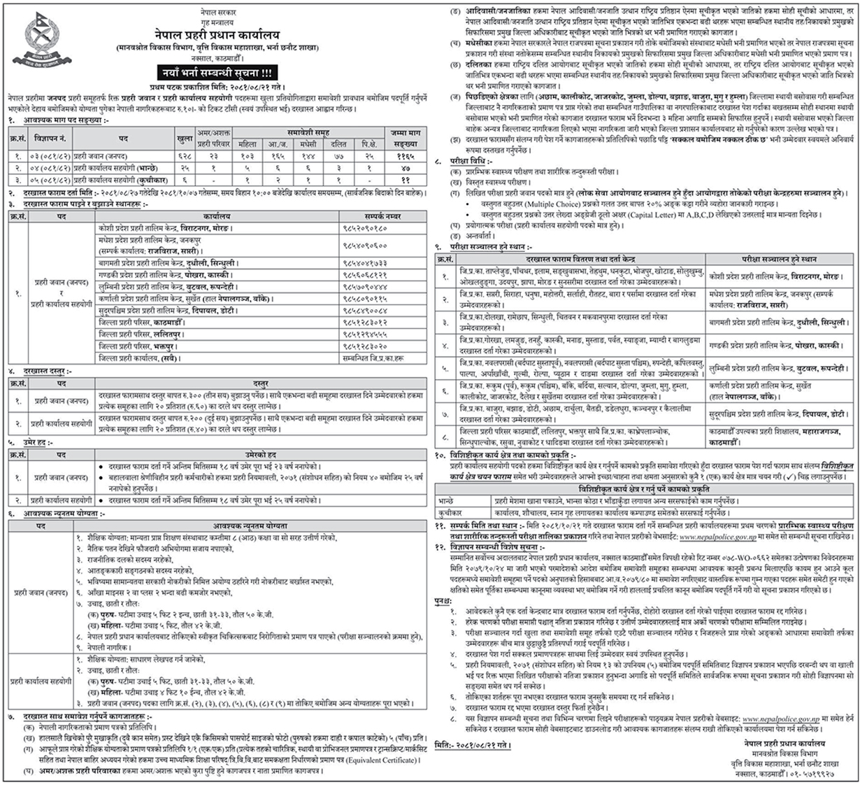 नयाँ भर्ना हुन इच्छुक नागरिकहरूले मंसिर २७ गतेदेखि माघ ७ गतेसम्म सम्बन्धित कार्यालयहरूमा कार्यालय समयभित्र दरखास्त फारम लिन तथा बुझाउन सक्नेछन् । दरखास्त आव्हान सम्बन्धि विस्तृत विवरण सहितको सूचना तथा सम्बन्धित पदको पाठ्यक्रम नेपाल प्रहरीको वेवसाइटमा समेत राखिएको छ ।