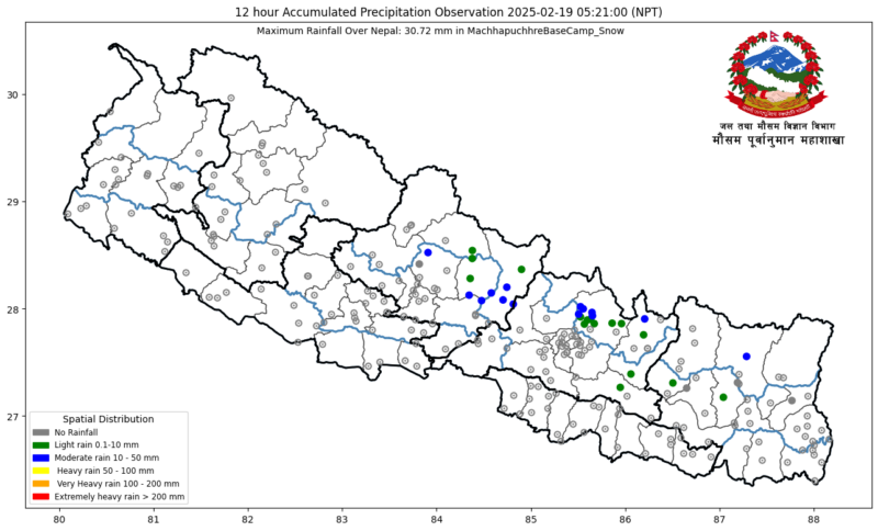 त्यसैगरी, राति सुदूरपश्चिम,कर्णाली र लुम्बिनी प्रदेशलगायत देशका पहाडी भू–भागमा आंशिकदेखि साधारणतया बदली रही बाँकी भागमा आंशिक बदली रहने छ भने उच्च पहाडी तथा हिमाली भागका एक–दुई स्थानमा हल्का हिमपातको सम्भावना रहेको छ ।