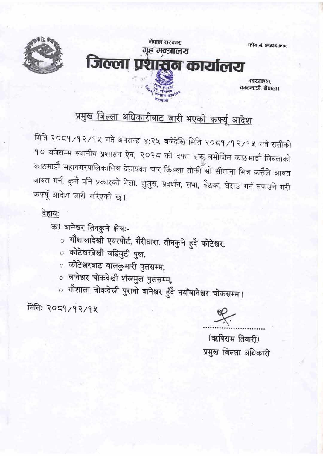 जिल्ला प्रशासन कार्यालयका अनुसार बानेश्वर–तीनकुने क्षेत्र, गौशला–विमानस्थल–गैरीधारा–तीनकुने हुँदै कोटेश्वरसम्म, कोटेश्वरदेखि जडीबुटी पुल, कोटेश्वरदेखि बालकुमारी पुलसम्म, बानेश्वर चोकदेखि शङ्खमुल पुलसम्म र गौशला चोकदेखि पुरानो बानेश्वर हुँदै नयाँ बानेश्वर चोकसम्म कर्फ्यू आदेश जारी भएको हो ।