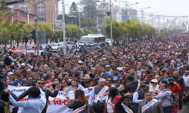 नेपाल शिक्षक महासङ्घको नेतृत्वमा शिक्षकहरूले गत चैत २० गतेदेखि बिहान ११ बजेदेखि दिउँसो ४ बजेसम्म माइतीघरबाट नयाँ बानेश्वरसम्म प्रदर्शन गरिरहेका छन् ।