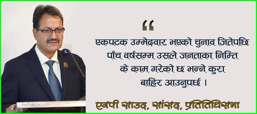 सांसद साउदले भन्नुभयो, “संविधान संशोधन गरी शासकीय स्वरुपलाई सानो, छोटो र छरितो बनाउनुपर्ने छ, मितव्ययी बनाउनै पर्छ, जनतालाई आर्थिक भार नपर्ने किसिमको शासकीय स्वरुप बनाउनुपर्छ ।” सङ्घीय संसद्का सांसद र प्रदेशसभाका सांसदको सङ्ख्या पनि घटाउनुपर्ने उहाँको भनाइ छ । राससका समाचारदाता सुशील दर्नालले सांसद साउदसँग गर्नुभएको कुराकानीको सम्पादित अंशः