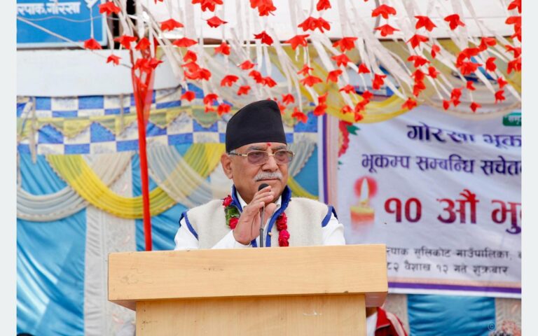 ‘गोरखा भूकम्प’को केन्द्रविन्दु बारपाक सुलिकोट गाउँपालिका–२, बारपाकमा शुक्रबार आयोजित ‘भूकम्प स्मृति दिवस’ कार्यक्रमलाई सम्बोधन गर्दै अध्यक्ष दाहालले गोरखाको विकास निर्माणको कामलाई अगाडि बढाउन सक्दो पहल र प्रयत्न भइरहेको बताउनुभयो ।