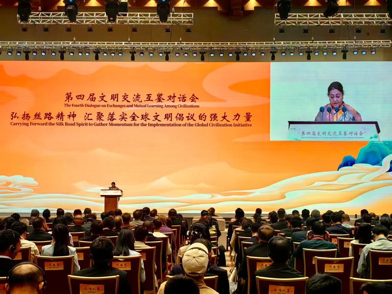 चीन भ्रमणका क्रममा गान्सु प्रान्तको डुन्ह्वाङमा आयोजित सभ्यताहरुबीचको आदान प्रदान र पारस्परिक सिकाइ सम्बन्धी चौथो संवाद कार्यक्रमलाई मुख्य वक्ताका रुपमा सम्बोधन गर्दै उहाँले विभिन्न संस्कृतिहरुको सुन्दर बगैँचा रहेको संसारमा विविध जातीय समूह, भाषा र संस्कृतिक संगम सहअस्तित्व रहेको उल्लेख गर्नुभयो ।