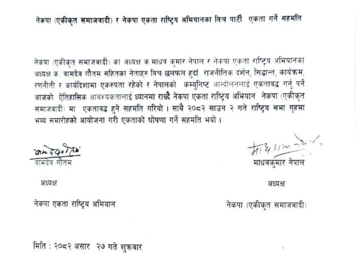 नेपाल कम्युनिष्ट पार्टी (एकीकृत समाजवादी) र वामदेव गौतम नेतृत्वको नेकपा एकता राष्ट्रिय अभियानकाबीच एकता हुने भएको छ । पार्टी एकताका लागि एकीकृत समाजवादीका अध्यक्ष माधवकुमार नेपाल र नेकपा एकता राष्ट्रिय अभियानका अध्यक्ष गौतमले शुक्रबार हस्ताक्षर गर्नुभएको हो ।
