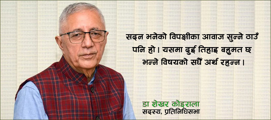 नेपाल विद्युत् प्राधिकरणको विषयमा प्रधानमन्त्रीले पटकपटक संसद्मा जवाफ दिनुपर्यो । अहिले राष्ट्रिय स्वतन्त्र पार्टी र राष्ट्रिय प्रजातन्त्र पार्टीका सांसदले संसद् बहिष्कार गरिरहनुभएको छ । समस्या समाधान गर्न प्रतिपक्षीय भूमिकामा रहनुभएका उहाँहरूसँग गहन छलफल गरिनुपर्छ । सदन भनेको विपक्षीका आवाज सुन्ने ठाउँ पनि हो । यसमा दुई तिहाइ बहुमत छ भन्ने विषयको सधैँ अर्थ रहन्न ।