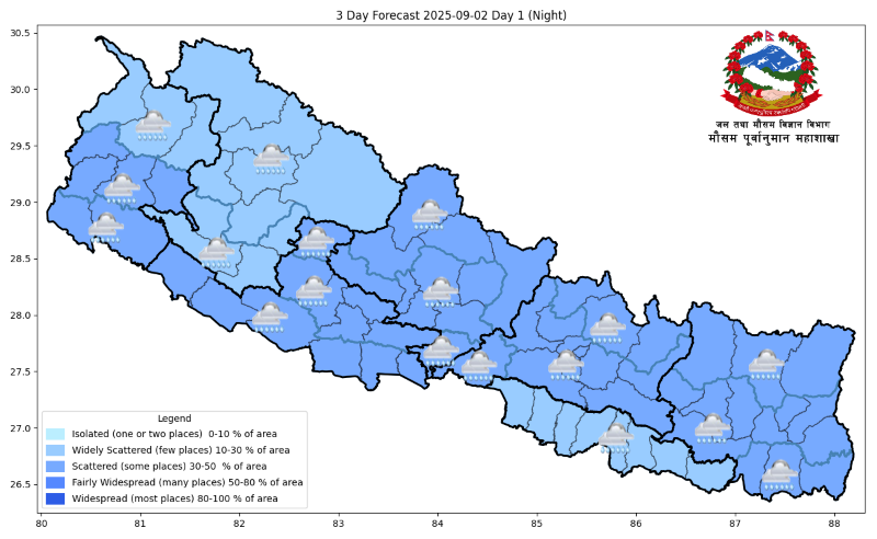 कोशी, मधेस, वाग्मती र गण्डकी प्रदेशका केही तथा अन्य प्रदेशका पहाडी भागका केही स्थानमा मध्यम वर्षाको सम्भावना छ । कोशी, तराई र वाग्मती प्रदेशका पहाडी भागका एकदुई स्थानमा भारी वर्षाको सम्भावना छ ।