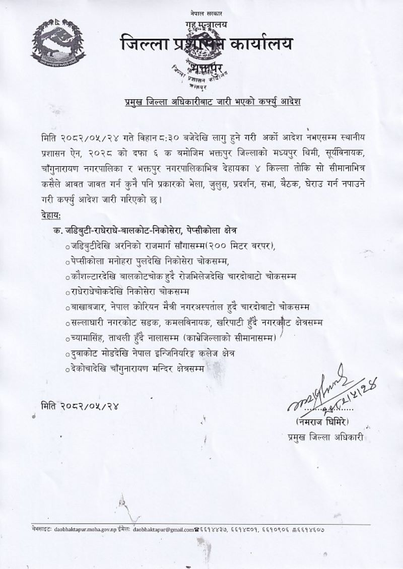 प्रमुख जिल्ला अधिकारी नमराज घिमिरेद्वारा जारी गरिएकोे आदेशमा भनिएको छ, “स्थानीय प्रशासन ऐन, २०२८ को दफा ६ (क) भक्तपुर नगरपालिका, चाँगुनारायण नगरपालिका, सूर्यविनायक नगरपालिका र सूर्यविनायक नगरपालिकाभित्रको निर्धारित चार किल्लाभित्रका क्षेत्रमा कोही पनि मानिस आवतजावत गर्न, कुनै प्रकारको भेला, जुलु, प्रदर्शन, सभा, बैठक, घेराउ गर्न नपाउने गरी आदेश जारी गरिएको छ ।”