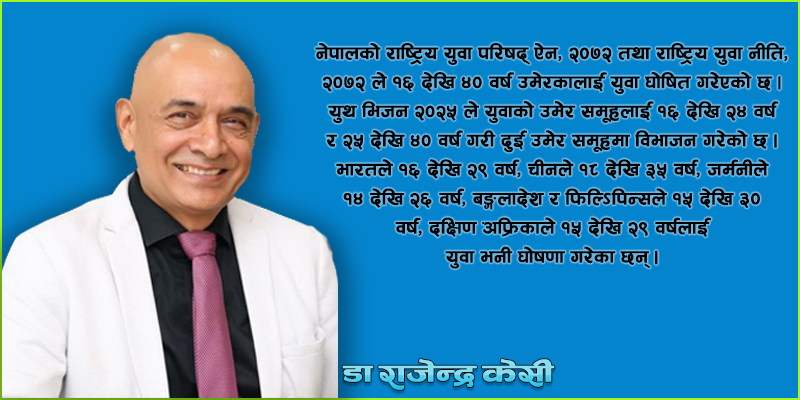 युवाको परिभाषा आआफ्नै तरिकाले भने पनि अधिकांश देशमा युवाको उमेर १५ देखि ३५ वर्षको उमेरलाई प्राथमिकता दिएको पाइन्छ । राष्ट्रसङ्घीय जनसङ्ख्या कोषले भने काम गर्नसक्ने उमेर भनेको १५ देखि ६४ वर्षको जनसङ्ख्यालाई मानेको छ तर हाम्रो देशमा भने ४१ वर्षदेखि माथिको उमेरलाई पाको उमेरको संज्ञा दिइएको छ । कैयन् विभिन्न सेवामा काम गर्ने मानिस ५० वर्षदेखि पेन्सन पकाएका छन् भने ५९ वर्षमा त काम गर्न नै नसक्ने भनेर अवकाश गरी घरमा नै बसेको पाइन्छ ।