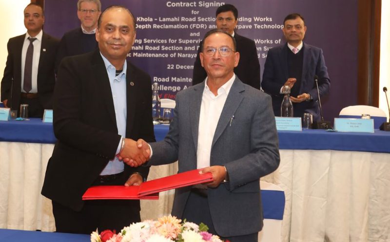 आज एक कार्यक्रमबीच एमसिए-नेपालका कार्यकारी निर्देशक खड्गबहादुर विष्ट र शर्मा-कुमार संयुक्त उपक्रमका आधिकारिक प्रतिनिधि सौरभ शर्माले धान खोलाबाट लमहीसम्मको सडकखण्डको स्तरोन्नति कार्यसम्बन्धी सम्झौता पत्रमा हस्ताक्षर गर्नुभयो ।