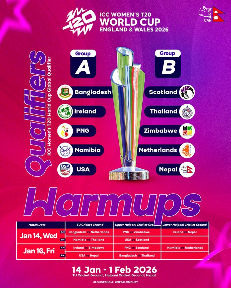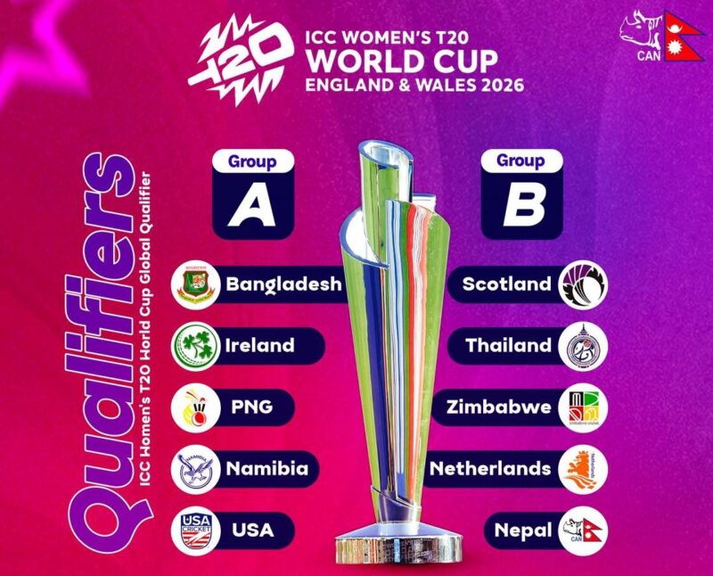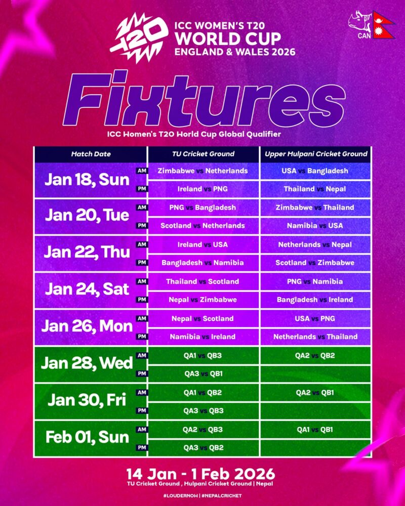क्यानले आज सार्वजनिक गरेको खेल तालिकाअनुसार नेपाल समूह ‘बी’ मा परेको छ । नेपाली महिला क्रिकेट टोली पहिलोपटक विश्वकप एसिया छनोट पार गरेर ग्लोबल छनोटमा पुगेको हो । नेपालको समूहमा स्कटल्यान्ड, थाइल्यान्ड, नेदरल्यान्ड्स र जिम्बावे रहेका छन् ।