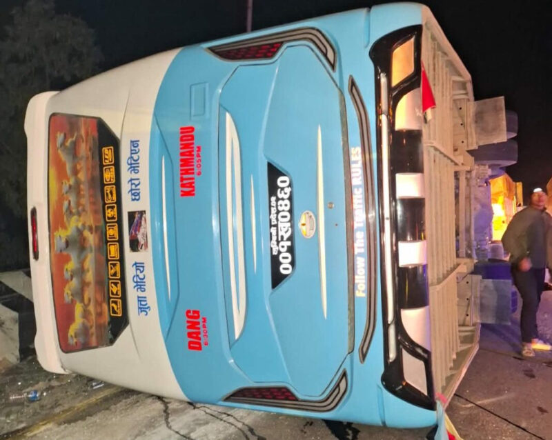 आज बिहान भरतपुर महानगरपालिका–२९ घुमाउनेमा दाङबाट काठमाडौँ जाँदै गरेको लुम्बिनी प्रदेश ०२–००१ ख ०४६० नम्बरको बस अनियन्त्रित भई सडकमा पल्टिएको थियो ।