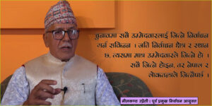 यो निर्वाचन हाम्रो एक प्रकारको निष्ठाको जाँच नै होभन्दा पनि हुन्छ । हामीले समयमै निष्पक्ष निर्वाचन गराउने र निर्वाचित सरकारलाई प्रजातान्त्रिक प्रक्रियाबाट सत्ता हस्तान्तरण गर्ने शपथ खाएका छौँ । त्यसैले पनि चुनाव सार्ने या सर्ने भन्ने नै हुँदैन ।