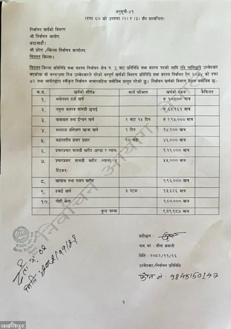 निर्वाचन आयोगमा पेस गरिएको विवरणअनुसार रु नौ लाख ८९ हजार ९८७ खर्च भएको उल्लेख छ । आयोगमा पेस गरिएको पत्रमा मनोनयन दर्ता खर्च रु १० हजार, नमूना मतपत्र सामग्री छपाइमा रु ६८ हजार १६१, यातायात तथा इन्धन खर्च रु दुई लाख ९५ हजार, मतदाता प्रशिक्षण खाजा खर्च रु १४ हजार २००, वडास्तरीय प्रचारप्रसार रु ४६ हजार, प्रचारप्रसारका लागि झण्डा र ब्याच खरिद रु एक लाख १२ हजार भएको जनाइएको छ ।