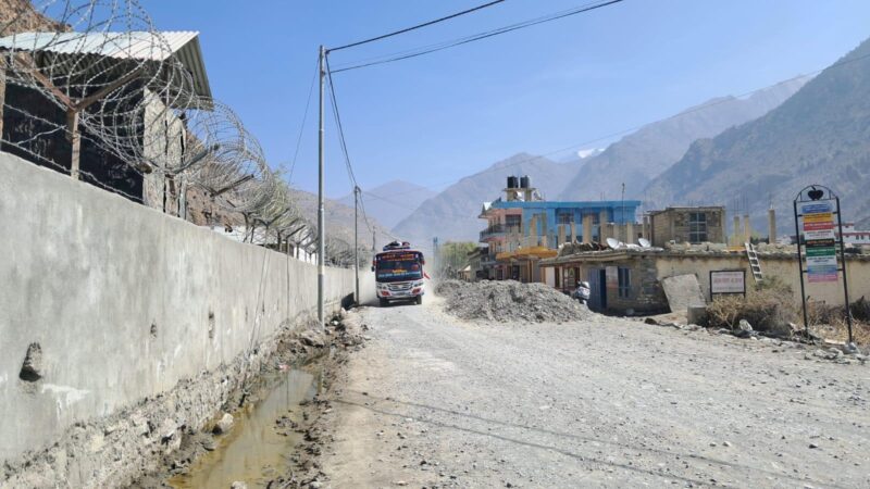 निर्माणाधीन सडकअन्तर्गत जोमसोमस्थित नेपाली सेनाको ब्यारेक अगाडि कालोपत्रका लागि फिलिङ गर्न माटो थुपारिएकाले सवारी आवागमनमा समस्या परेको छ । त्यसैगरी कालोपत्र ढिलाइ हुँदा त्यहाँस्थित सेनालाई धुवाँधुलोले पनि असर पुर्याएको देखिन्छ ।