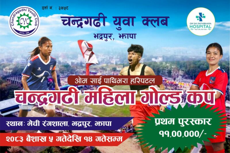 झापाको भद्रपुरमा रु ११ लाख नगद राशि पुरस्कार रहेको अन्तरराष्ट्रिय नकआउट महिला फुटबल गोल्डकप प्रतियोगिताको आयोजना हुने भएको छ ।