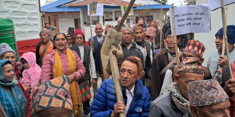 बाँदरपीडित किसानद्वारा कृषि औजारसहित प्रदर्शन