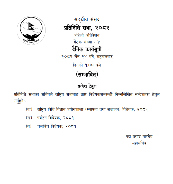 आजको बैठकमा ‘राष्ट्रिय विधि विज्ञान प्रयोगशाला (स्थापना तथा सञ्चालन ) विधेयक, २०८१’, ‘पर्यटन विधेयक, २०८१’ र ‘चलचित्र विधेयक, २०८१’ प्रस्तुत गर्ने सम्भावित कार्यसूची छ ।
