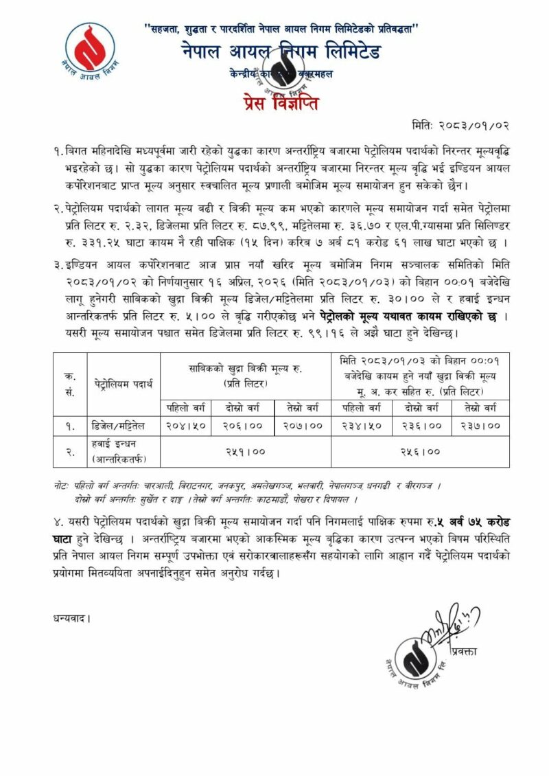 नेपाल आयल निगमले पेट्रोलियम पदार्थको मूल्यवृद्धि गरेको छ ।