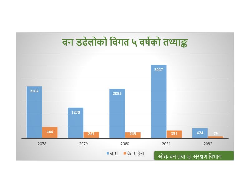 वन तथा भू–संरक्षण विभागले उपलब्ध गराएको तथ्याङ्कअनुसार २०७८ चैतमा ४६६ वटा डढेलोका घटना दर्ता भएका थिए । यो सङ्ख्या २०७९ चैतमा घटेर २६७ मा झरेको थियो । २०८० चैतमा २४९ र २०८१ चैतमा पुनः बढेर ३३१ पुगेको थियो । २०८२ चैतमा भने हालसम्मकै थोरै ७९ वटा मात्रै डढेलाका घटना दर्ता भएका छन् ।