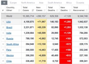 कोरोना भाइरसको पछिल्लो विश्व विवरण अनुसार भाइरस संक्रमणबाट सर्वाधिक प्रभावित ३ मुलुक अमेरिका, ब्राजिल र भारतमा २४ घण्टाको अवधिमा हजार बढी मानिसको ज्यान गएको छ ।